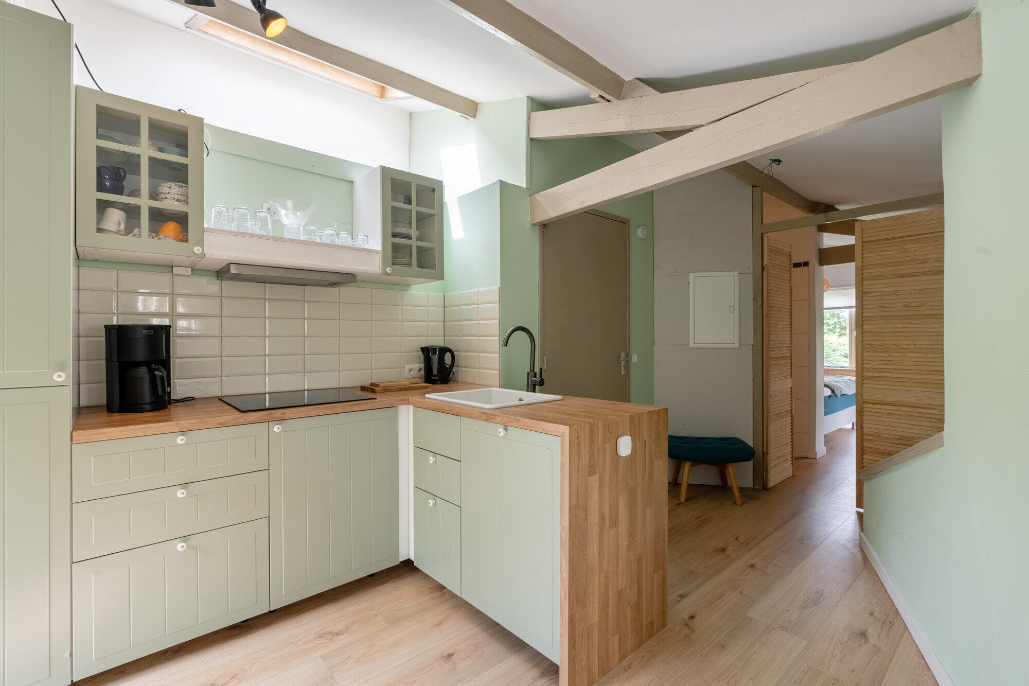 - Keuken voorzien van 4-pit inductievuur, porseleinen spoelbak, afzuigkap, frigo en vaatwasser;