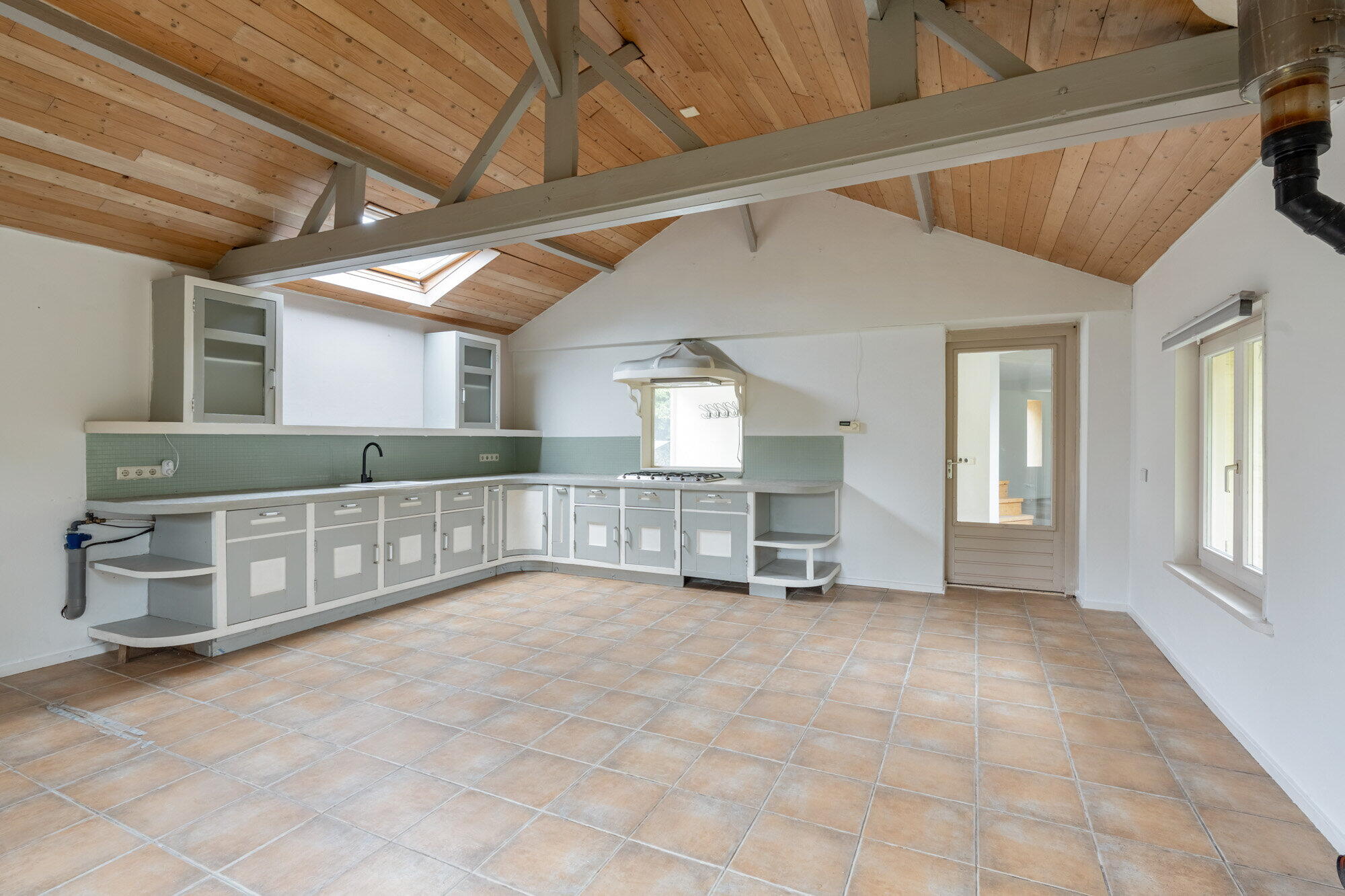 - Toegang tot de keuken via een achterdeur of via de inkom, voorzien van een 5-pit gasvuur van Smeg, afzuigkap (Etna), porseleinen spoelbak, veluxraam aanwezig en een mogelijkheid tot het installeren van een pelletkachel (deze was er voordien ook aanwezig);